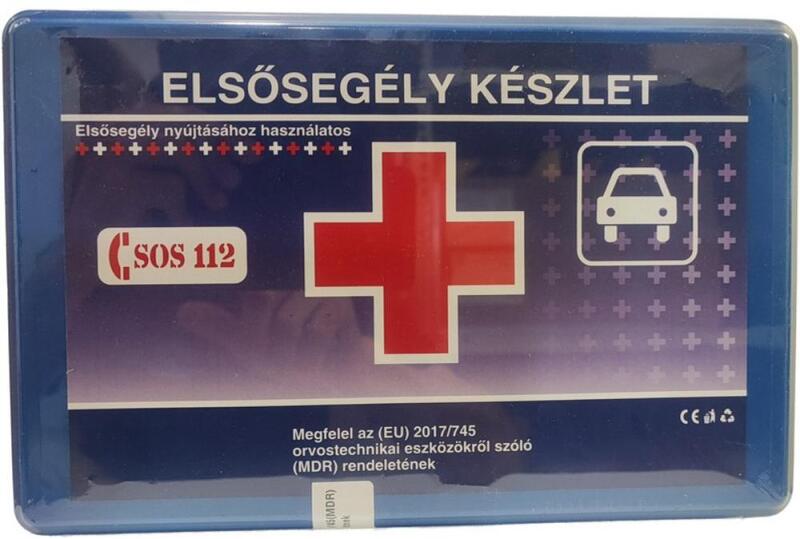 Elsősegély doboz jogszabályban előírt tartalommal B. típusú személygépkocsihoz.