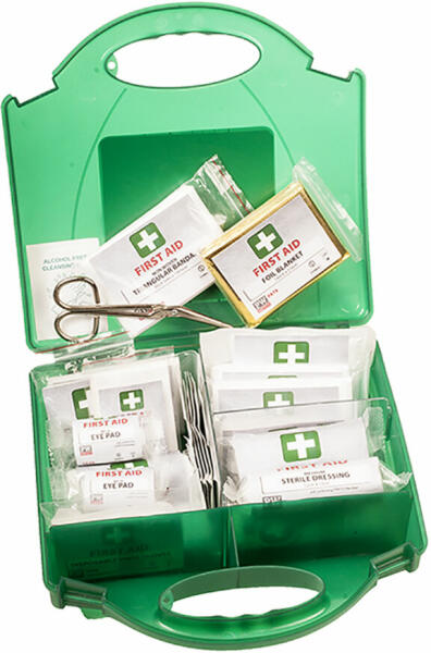 Közepes kockázatú munkahelyek (irodák raktárak) részére kialakított elsősegély láda. Robosztus zöld dobozban mely könnyen szállítható és falra is szerelhető. Steril kivitel.
