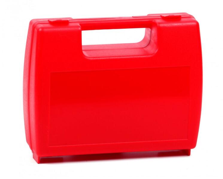 Praktikus piros műanyag koffer (25x20x8 cm), ideális elsősegély-készlethez, szerszámokhoz vagy egyéb felszerelésekhez. Tartós és könnyen hordozható.